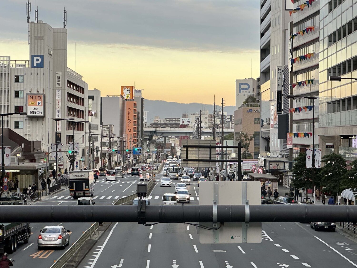 「a」を形どった阿倍野歩道橋から東を見れば、ビルの間から夕焼けの生駒山が見えていました。
