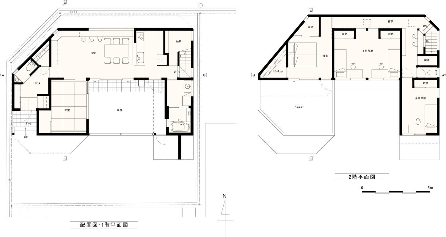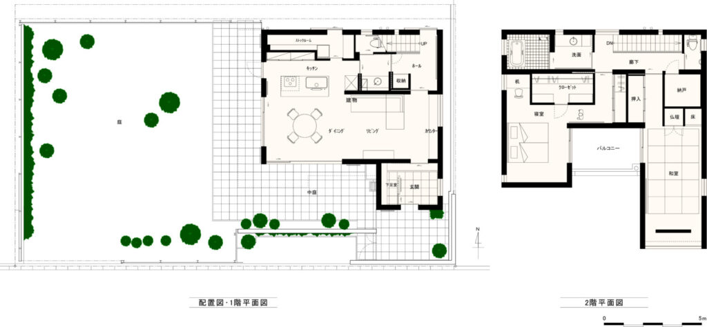 しかし離れれば離れる程、南側からの日当たりが悪くなるので、2階部分は北側にずらしました。