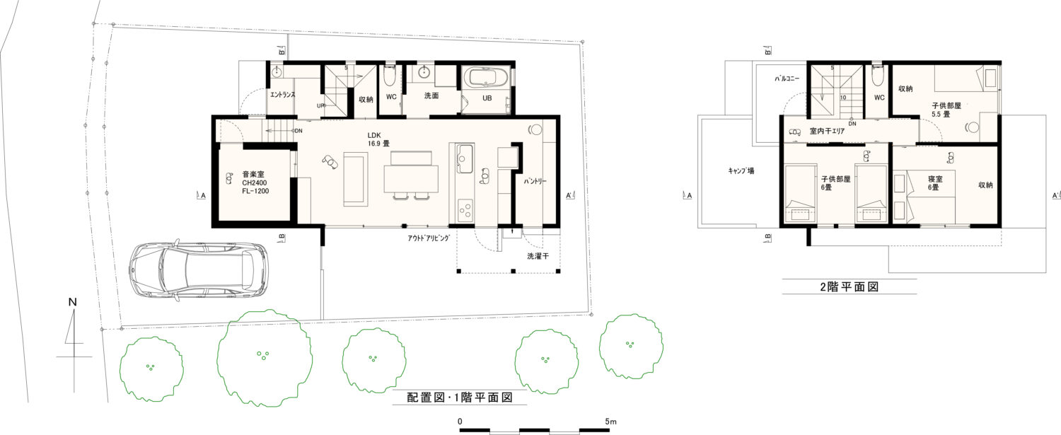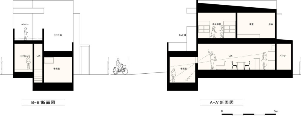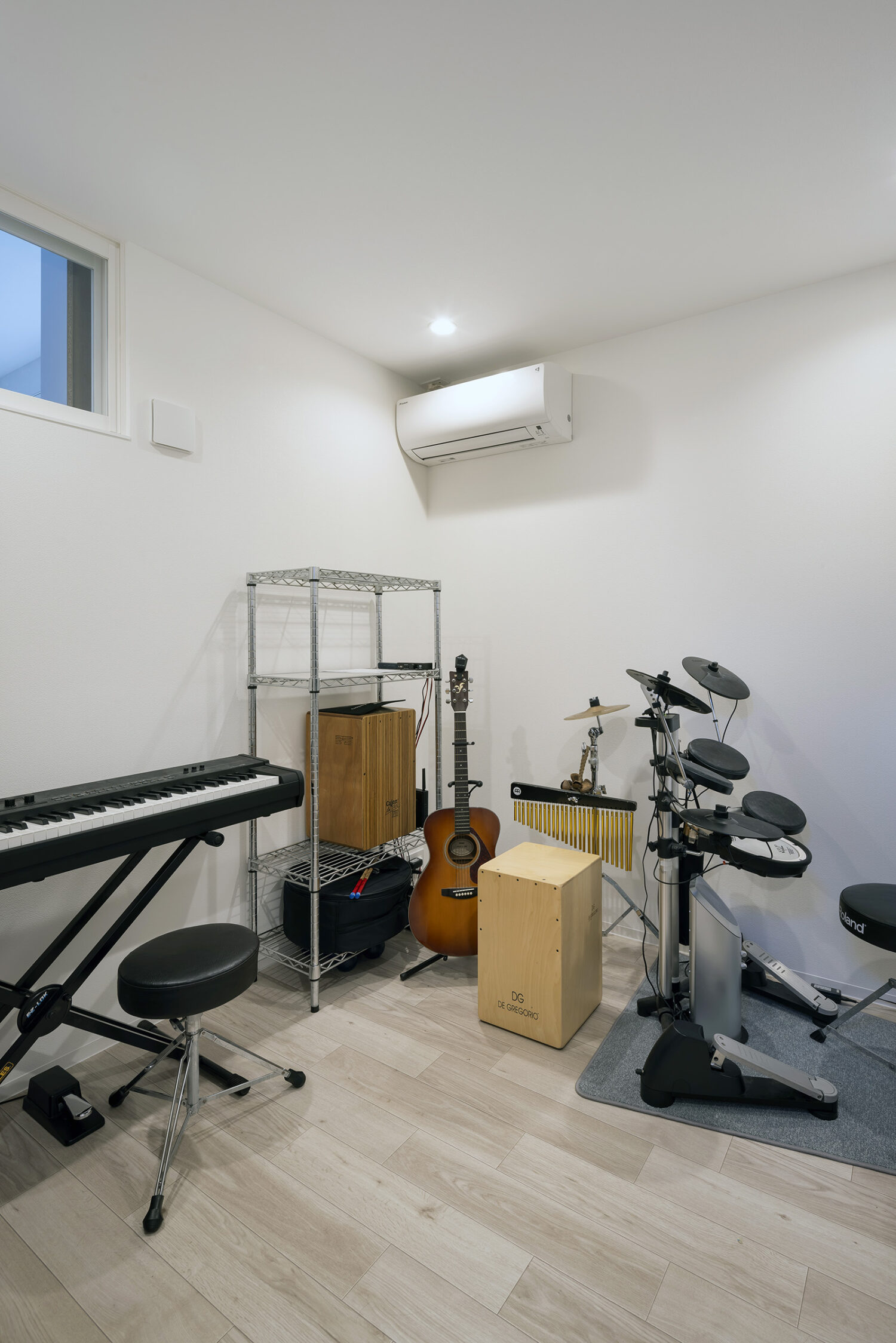 音楽室を半地下にすることによって、まず防音効果を高めています。