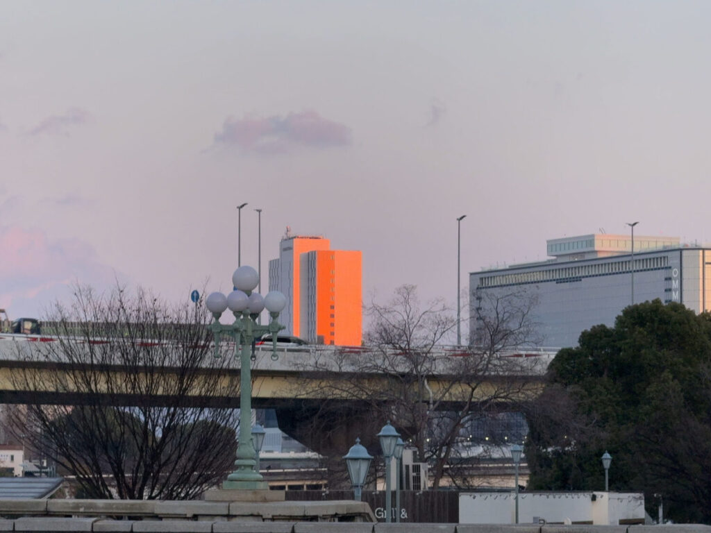その先に見える、ダブルツリーbyヒルトンは真っ赤に染まっています。