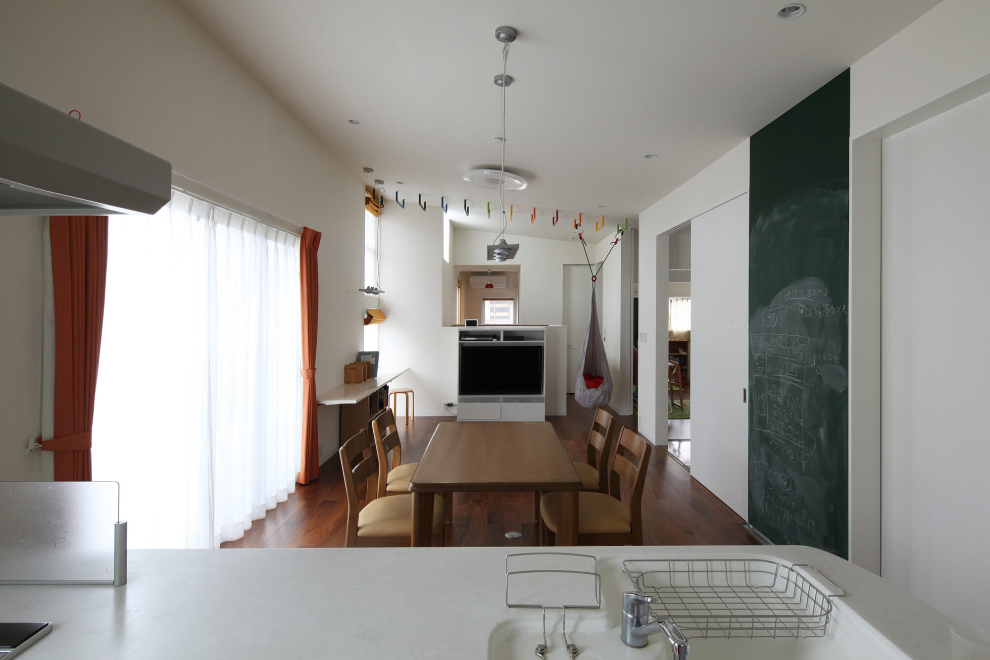 2階LDKは18畳ほどある1室空間だが、隣接する子供部屋から、ウンテイが貫かれている。室内側のみスペクトルの塗装を施しており、バルコニーへと続く。家の中で体を使って遊べるよう考えたものだ。