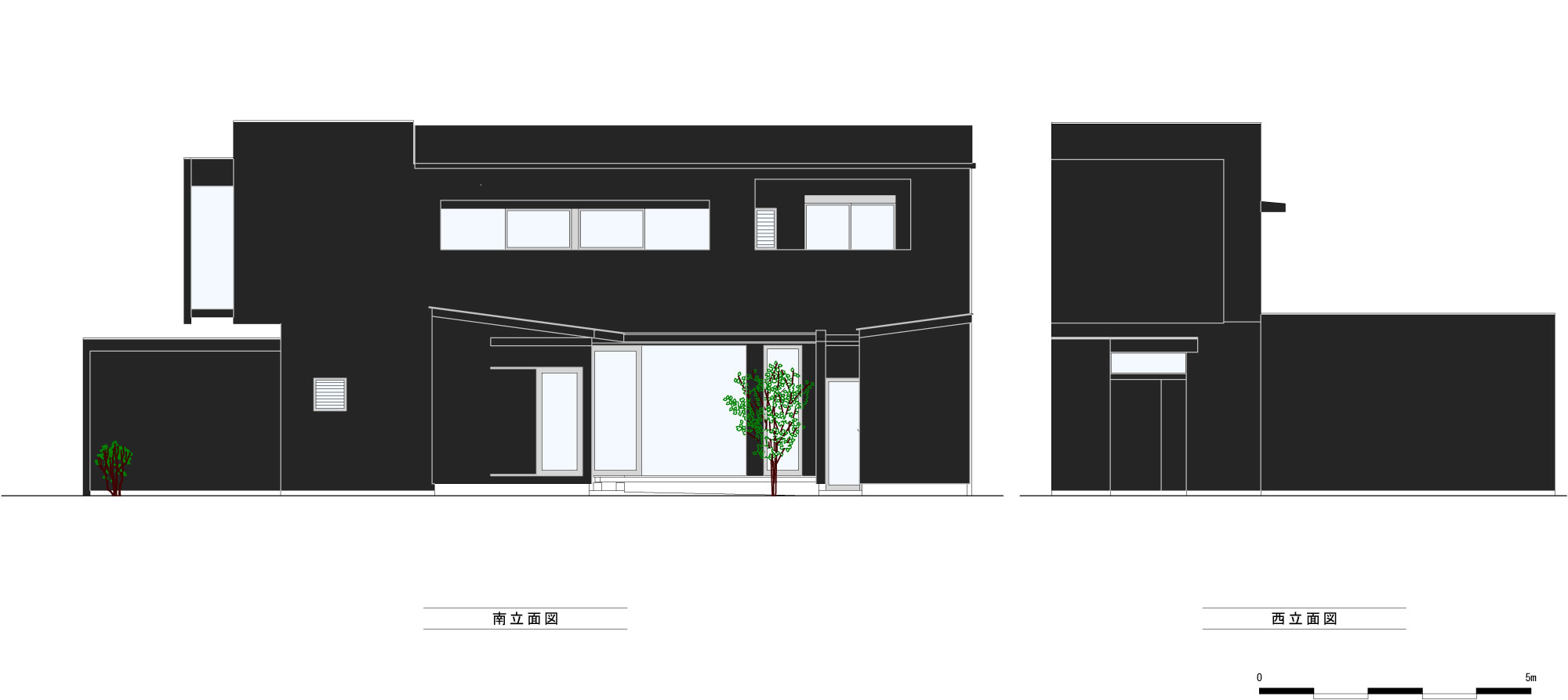 土地形状が独特で、それに合わせて「F」の字のプランとしている。「F」の縦線部が2層で、1階にLDK、2階に子供部屋等の個室。それぞれが南向きに並び、どこに居ても庭の緑を感じることができる。