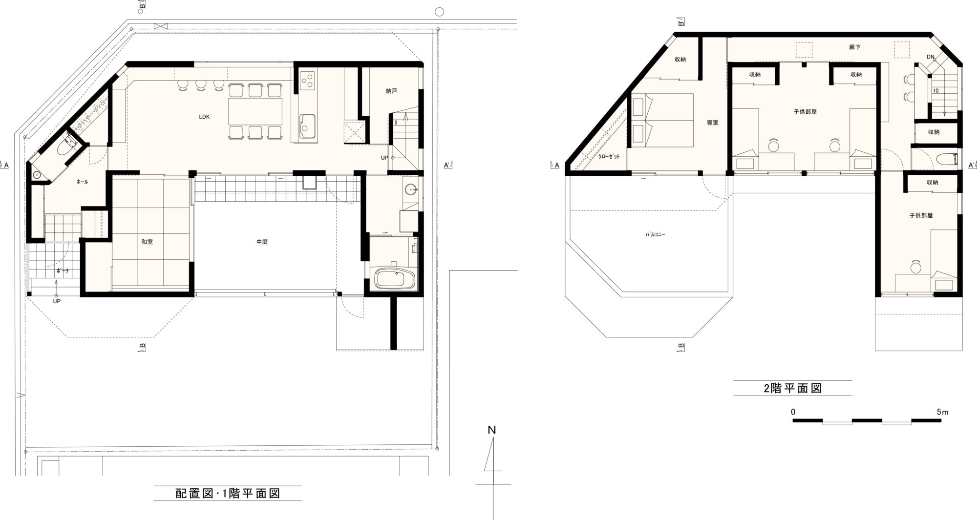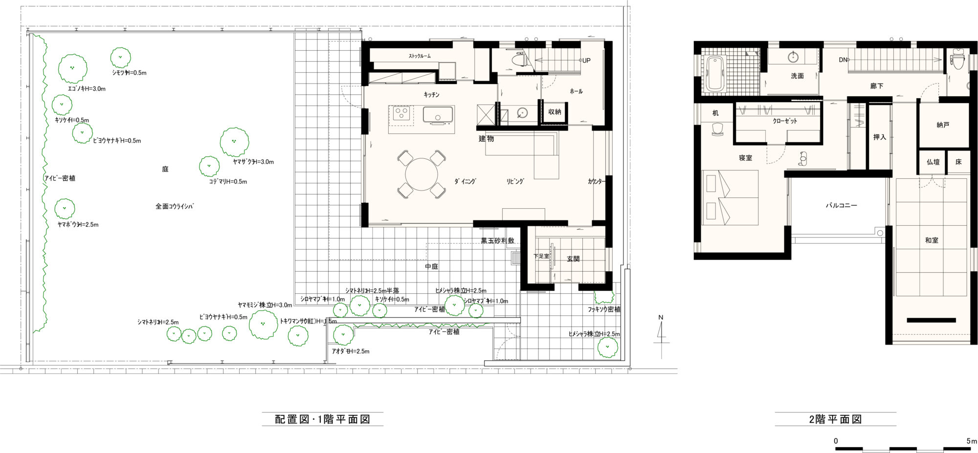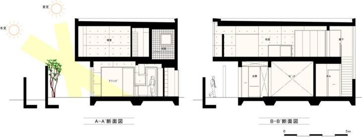 現在の庭の部分に旧住居があった為、庭と家が入れ替わる形での計画となった。必然的に大きな余白が生まれる事になる。1階のリビング・ダイニングは新たな庭との繋がりを重視した。加えて、南側には近隣の視線を気にせずとも良い開口を確保するため、壁に囲まれたアウトドアリビングを置く。向かい合わせになるキッチンに立てば、中庭の木々が常に目に映るよう考えた。