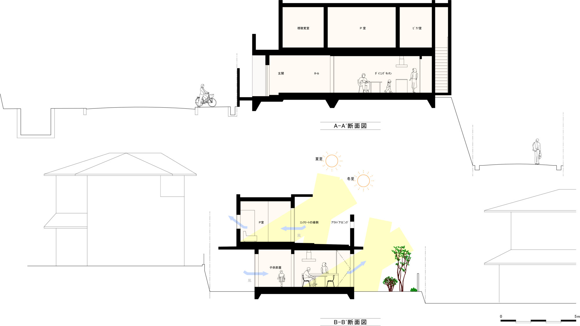 様々な敷地を見て、ようやく坂のある街が好きだと気付いたという。夫は学生時代を沖縄で過ごした。台風の多い沖縄はRC造の住宅も多い。RC打ちっぱなしのマンションで暮らしていたとき、光が壁に当たる様をみて、その美しさを知ったという。この2つのが、この計画の両輪となった。